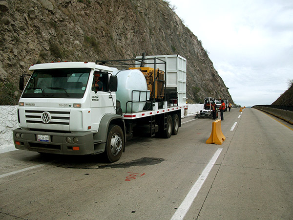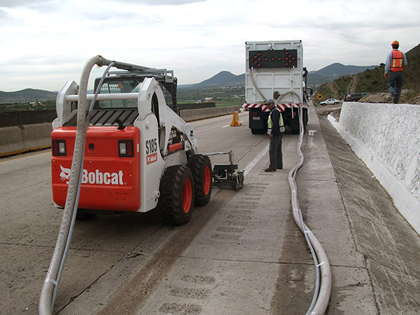Nuestro equipo se basa en agua a 40,000 lbs de presión, que al regularse alcanza a levantar la pintura sin maltratar la carpeta, y sin dejar rastro, quedando listo para volverse a pintar. Esto ha resultado una gran solución para aeropuertos o lugares donde se cambia el trafico y con ello su señalamiento.